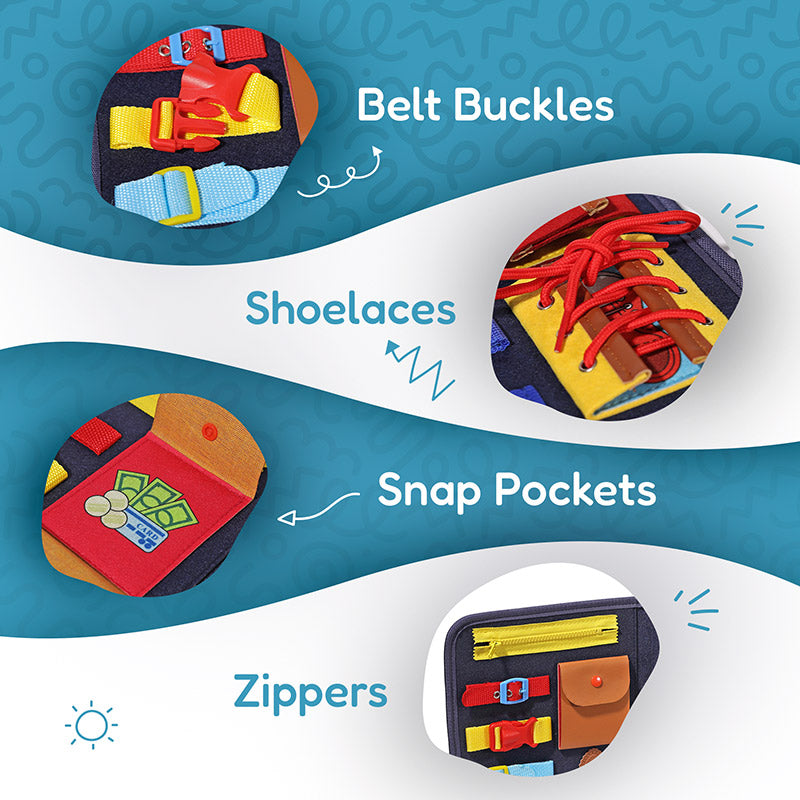 ✅ Buckles: Several types of buckles will occupy the attention of your little ones for a long time until they overcome the challenge. When they do, they will be super proud!