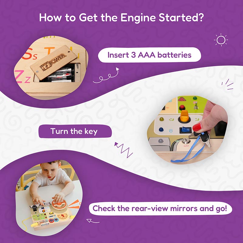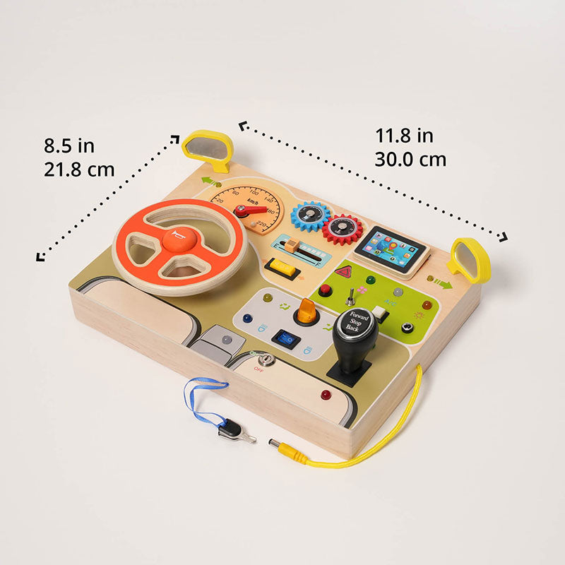 - Contains: (1) Busy Dashboard, 3 AAA batteries (not included)