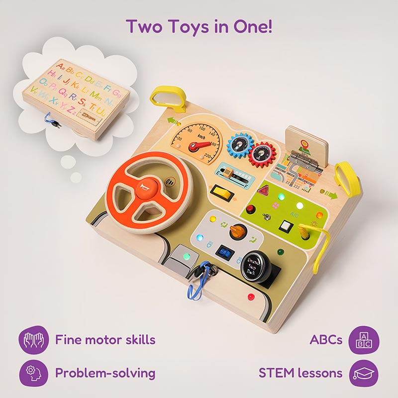 Imagine how thrilled your little one will be once they get a hold of this! Every single gadget on this board is interactive, from the horn to the gear shifter, blinkers, rearview mirror, AC, etc. And when you flip it over, there’s an ABC board!